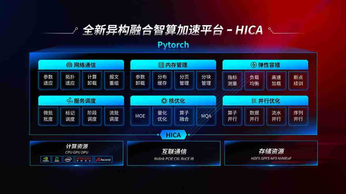 通过自研的服务层、、中间适配层、、以及调度编排算法,,,,采用数据并行、、、模型并行等多种并行方式,,把并行计算任务进行有效的分解,,使其分别由相应的软件栈和算力资源来承接。。当GPU资源变化,,,,HICA可以实时动态调度计算子任务并调整模型拓扑和架构,,,以充分聚合各种算力资源。。